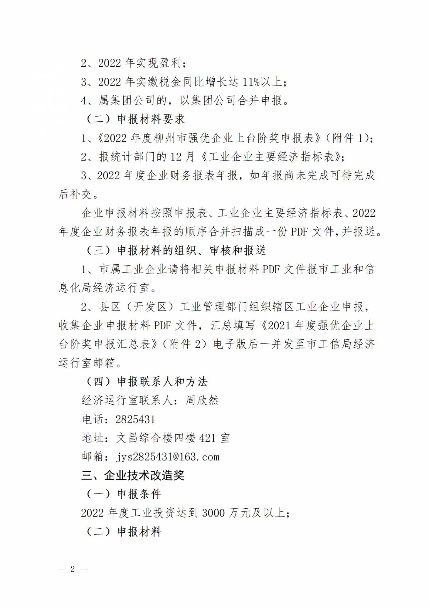 柳州市工業(yè)和信息化局關(guān)于申報(bào)2022年度做出較大貢獻(xiàn)的工業(yè)企業(yè)(園區(qū))有關(guān)獎(jiǎng)勵(lì)的通知(2023-02-28)